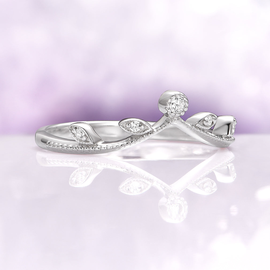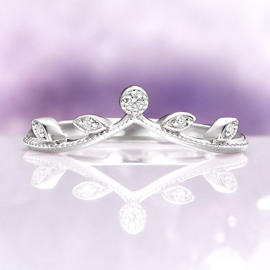 ► Design: Nature-inspired leaf & chevron crown style with milgrain accents