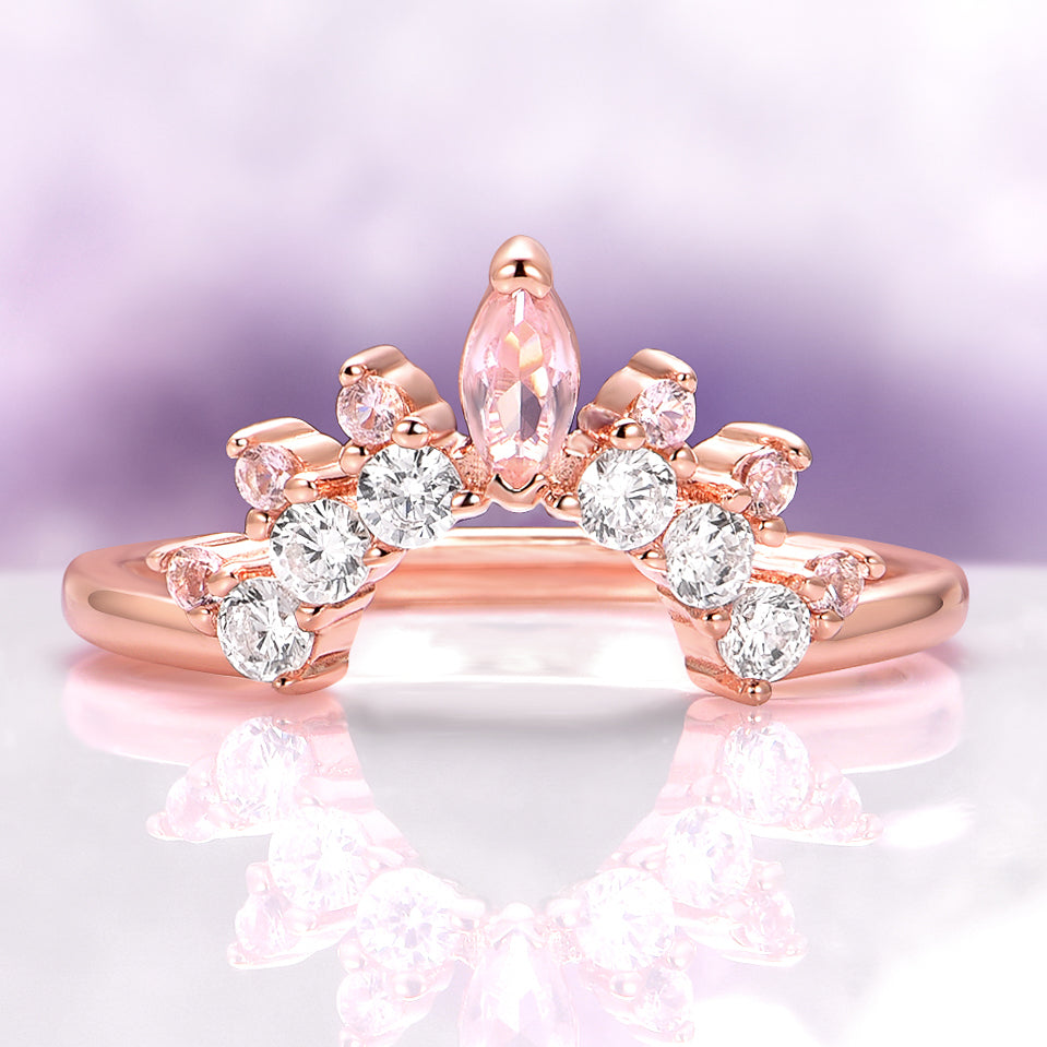 Introducing the Blush Pink Morganite Stacking Band, a crown-inspired design that balances elegance, romance, and modern craftsmanship. Handcrafted in solid 14K rose gold, this tiara-style band is accented with natural blush pink morganites, known for their soft pastel glow symbolizing compassion, harmony, and love. Sparkling moissanites or natural diamonds are set alongside the morganites, adding brilliance and refinement. Designed to stack beautifully with engagement rings or to shine on its own, this versatile band is a graceful expression of everlasting love and feminine charm.