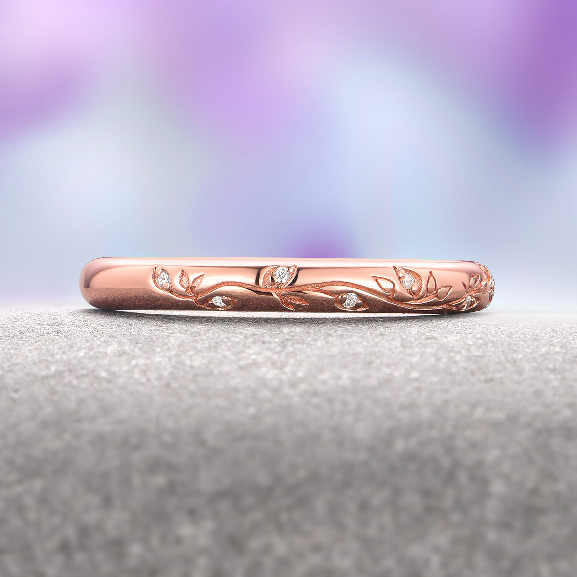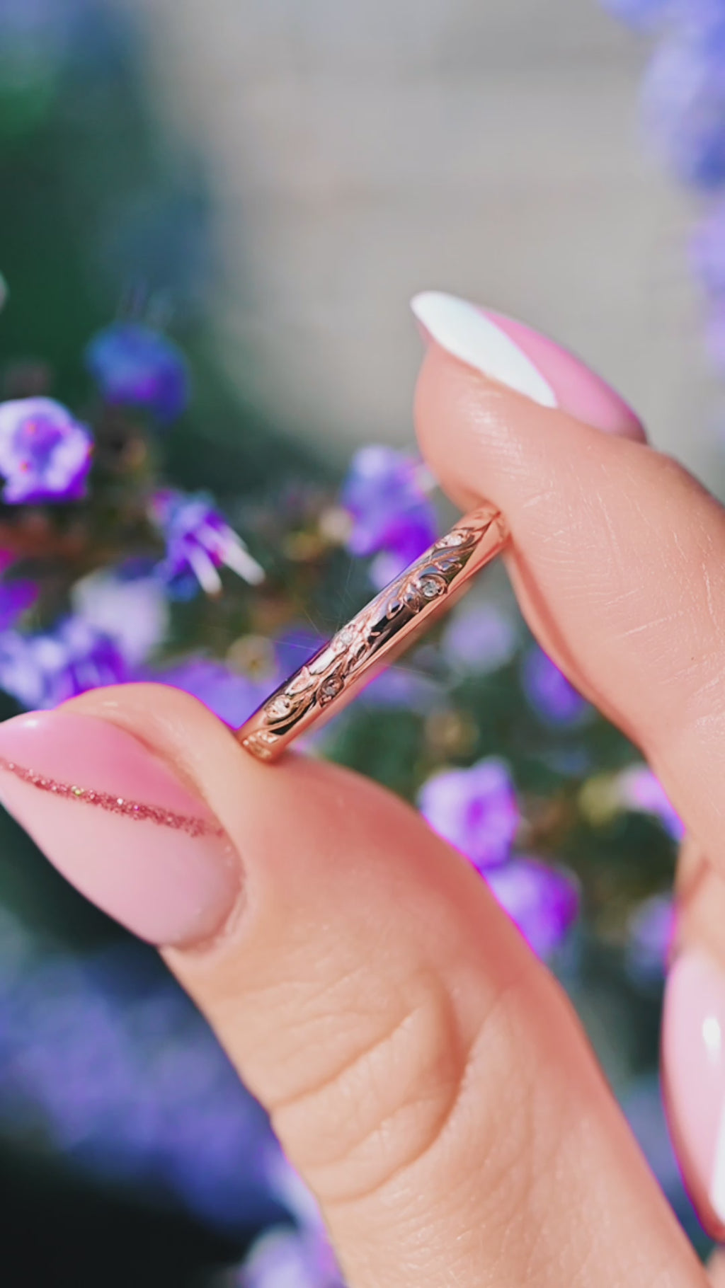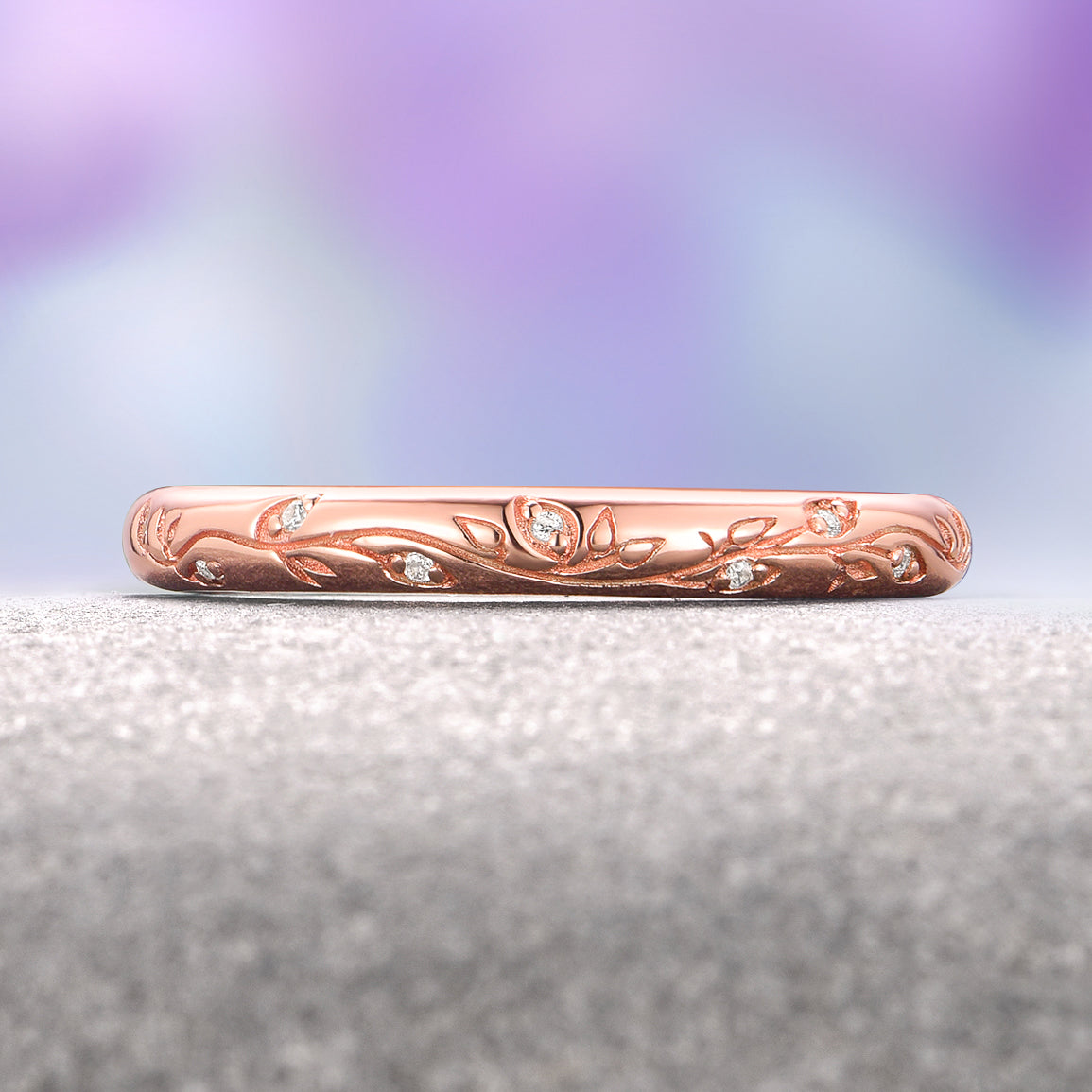 Add a touch of nature’s elegance with the Diamond Leaf Wedding Band, a graceful design handcrafted in 14K solid rose gold. This enchanting 2.5mm band features a delicate leaf motif adorned with natural diamond accents, symbolizing growth, beauty, and everlasting love. With its refined botanical pattern and sparkling details, this band is a meaningful choice for nature-inspired brides or lovers of organic, timeless design. Whether worn as a wedding band, stacking ring, or statement of personal style, it offers a uniquely romantic charm that will be treasured for years to come.