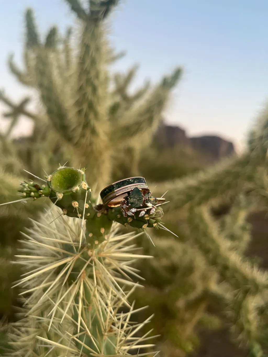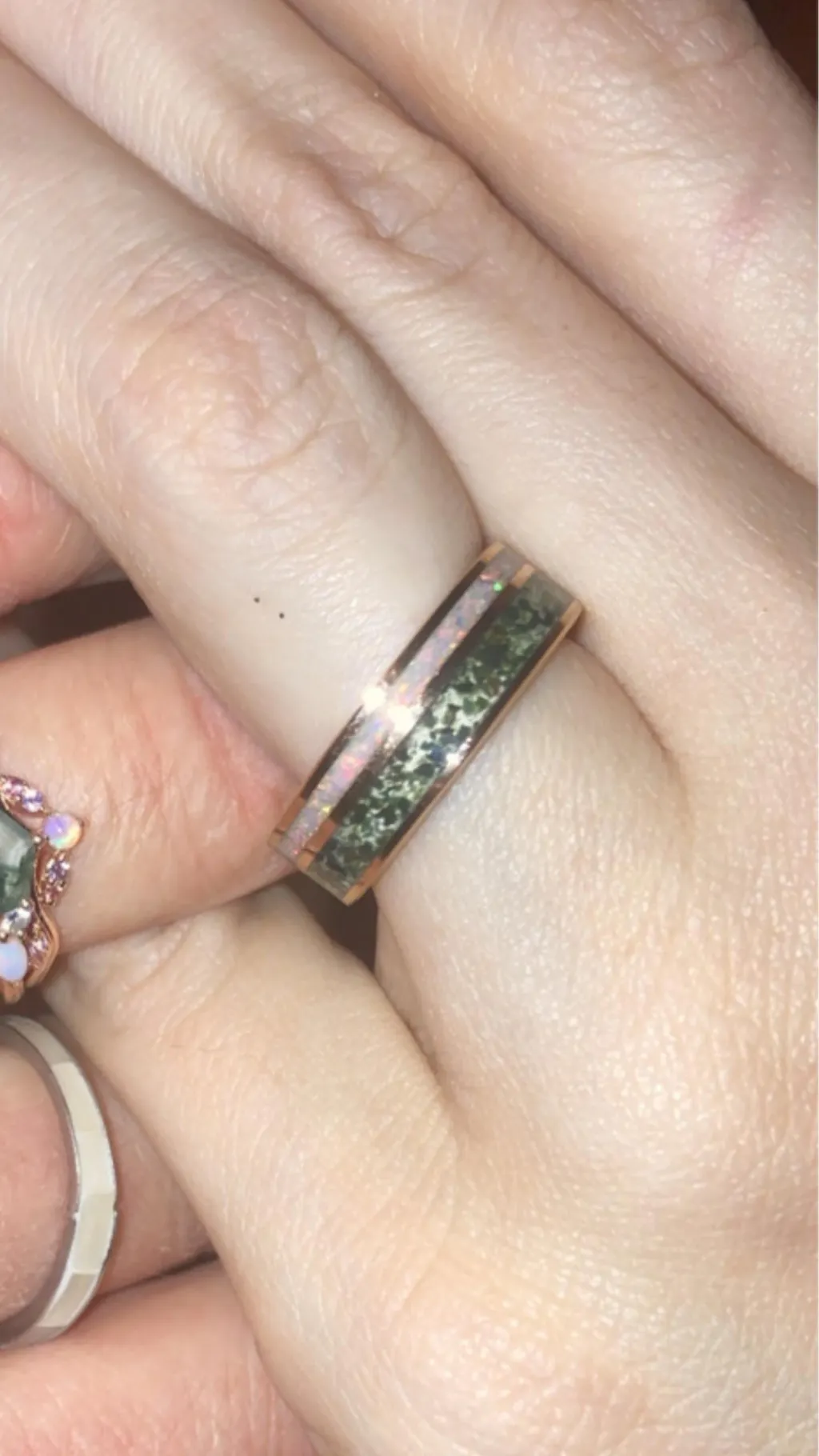 Moss Agate & Fire Opal Wedding Band- 6MM Rose Gold Tungsten
