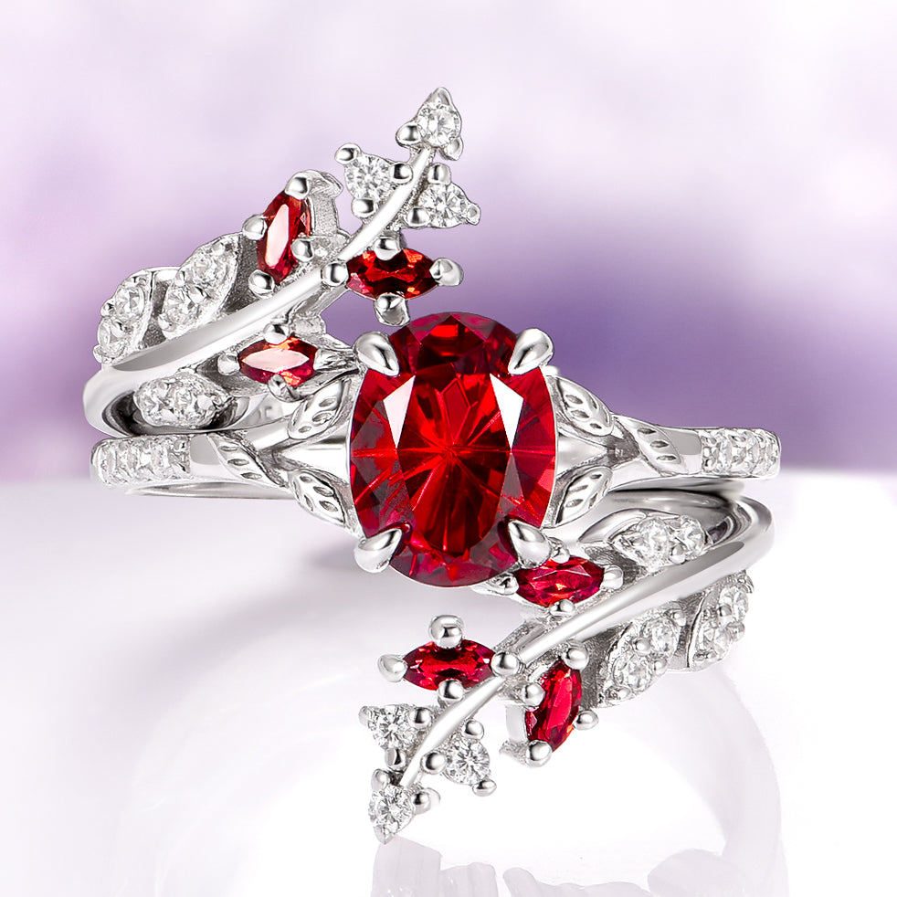 Perfect to wear on its own, as part of a bridal set, or as a distinctive stacking ring, this band embodies refined sophistication and fairytale charm. The rich crimson hue of garnet paired with the sparkle of moissanite captures the light from every angle—making it a breathtaking choice for lovers of nature-inspired romance.