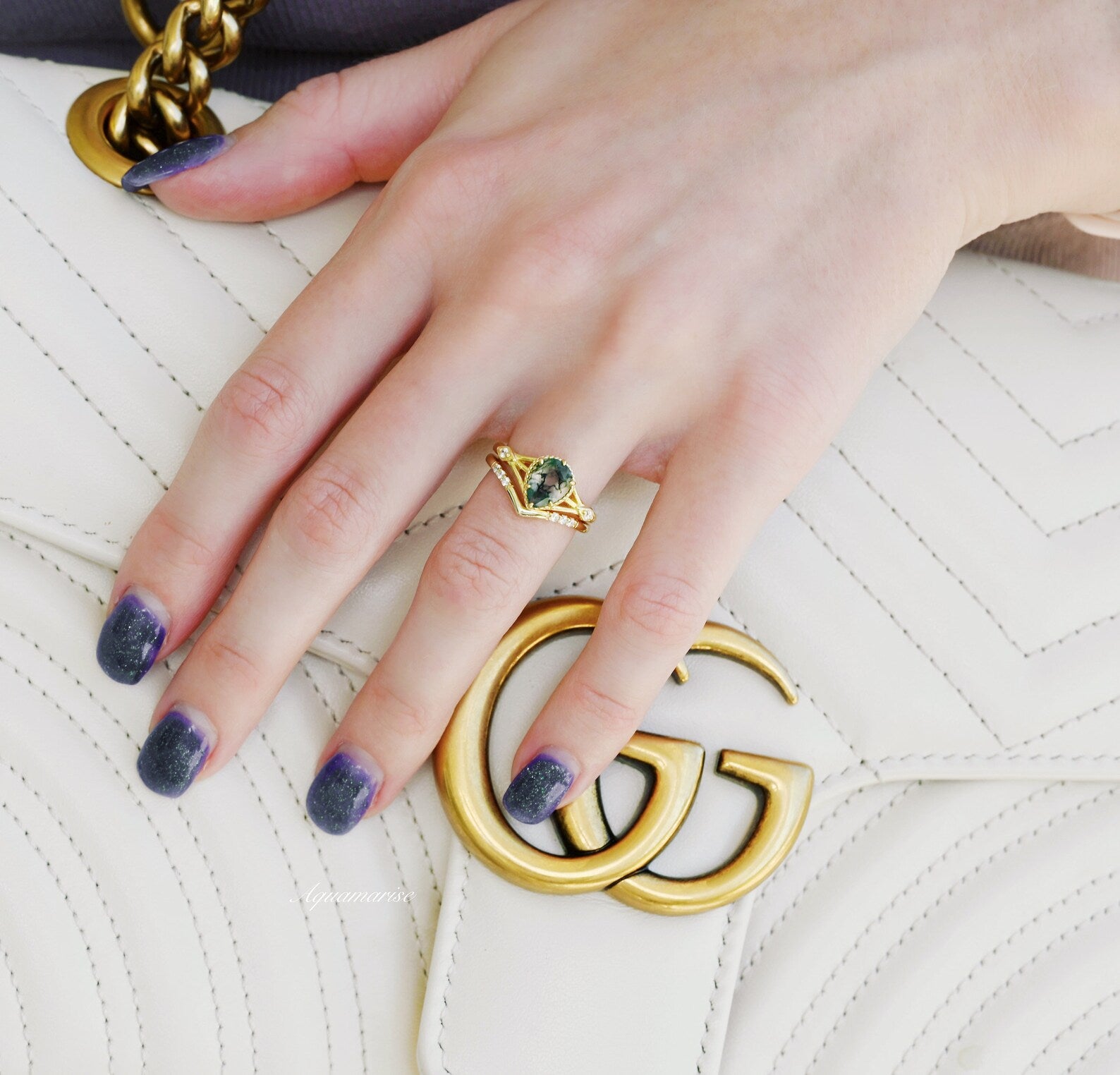 Celtic Teardrop Green Moss Agate Ring- 14K Yellow Gold Vermeil