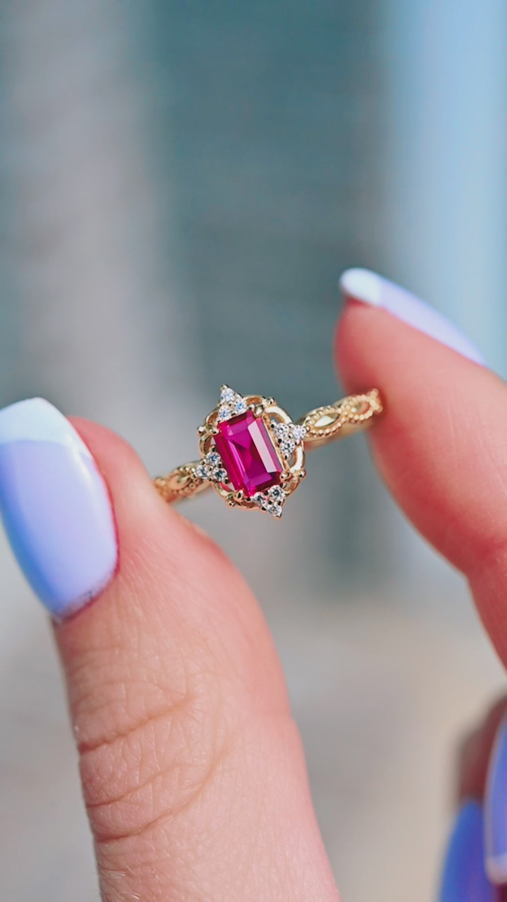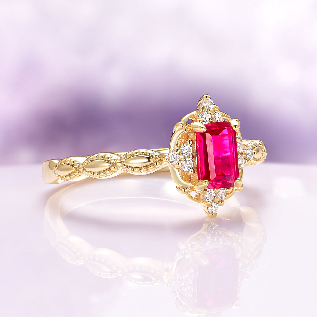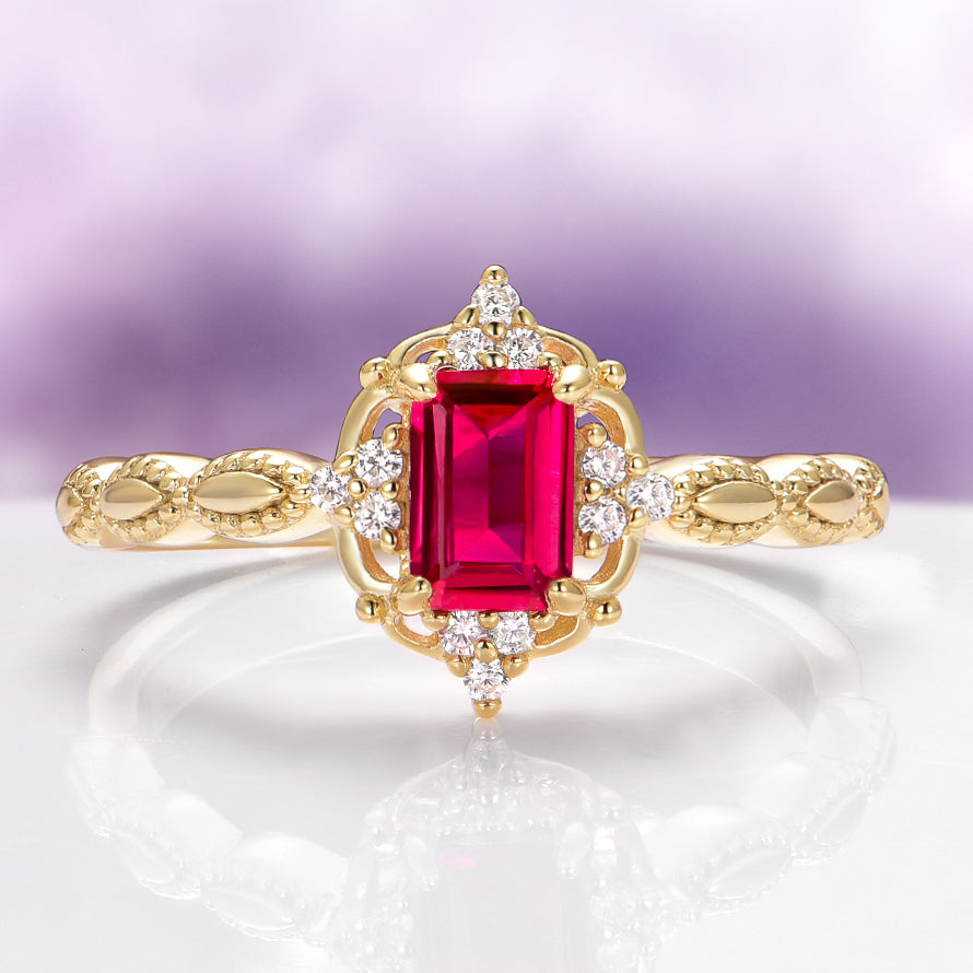 Celebrate timeless elegance with this Vintage Ruby Engagement Ring crafted in glowing 14K Yellow Gold Vermeilover solid 925 sterling silver. Featuring a rich emerald-cut lab-grown ruby, this heirloom-inspired piece brings Art Deco charm and bold sophistication to any jewelry collection. Whether given as a promise ring, engagement ring, or anniversary gift, it’s a perfect way to honor a July birthday or express your enduring love.
