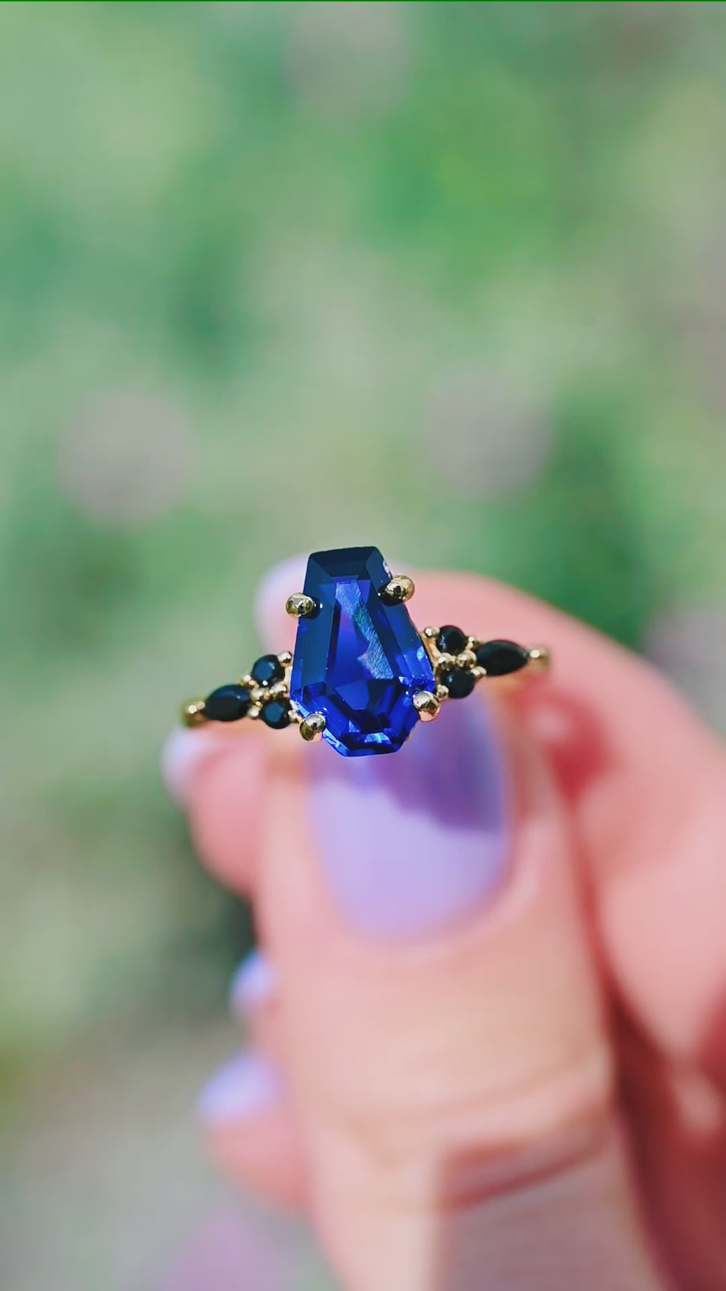 Coffin Cut Blue Sapphire & Black Onyx Engagement Ring in 14K Yellow Gold Vermeil