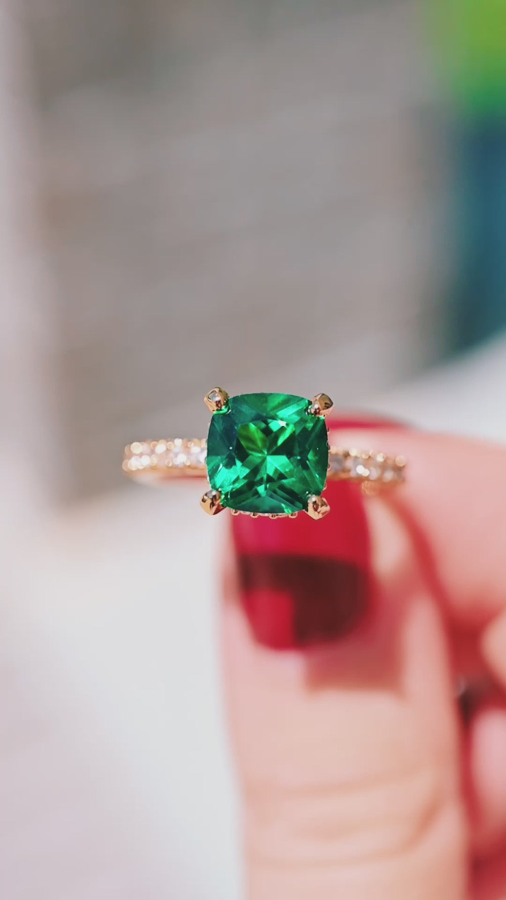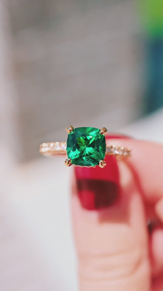 Capture the elegance of timeless romance with this stunning Cushion Cut Emerald Ring, crafted in 14K yellow gold vermeil over solid sterling silver. The deep green simulated emerald at the center evokes classic sophistication, enhanced by a delicate hidden halo and sparkling CZ accents that catch the light from every angle.