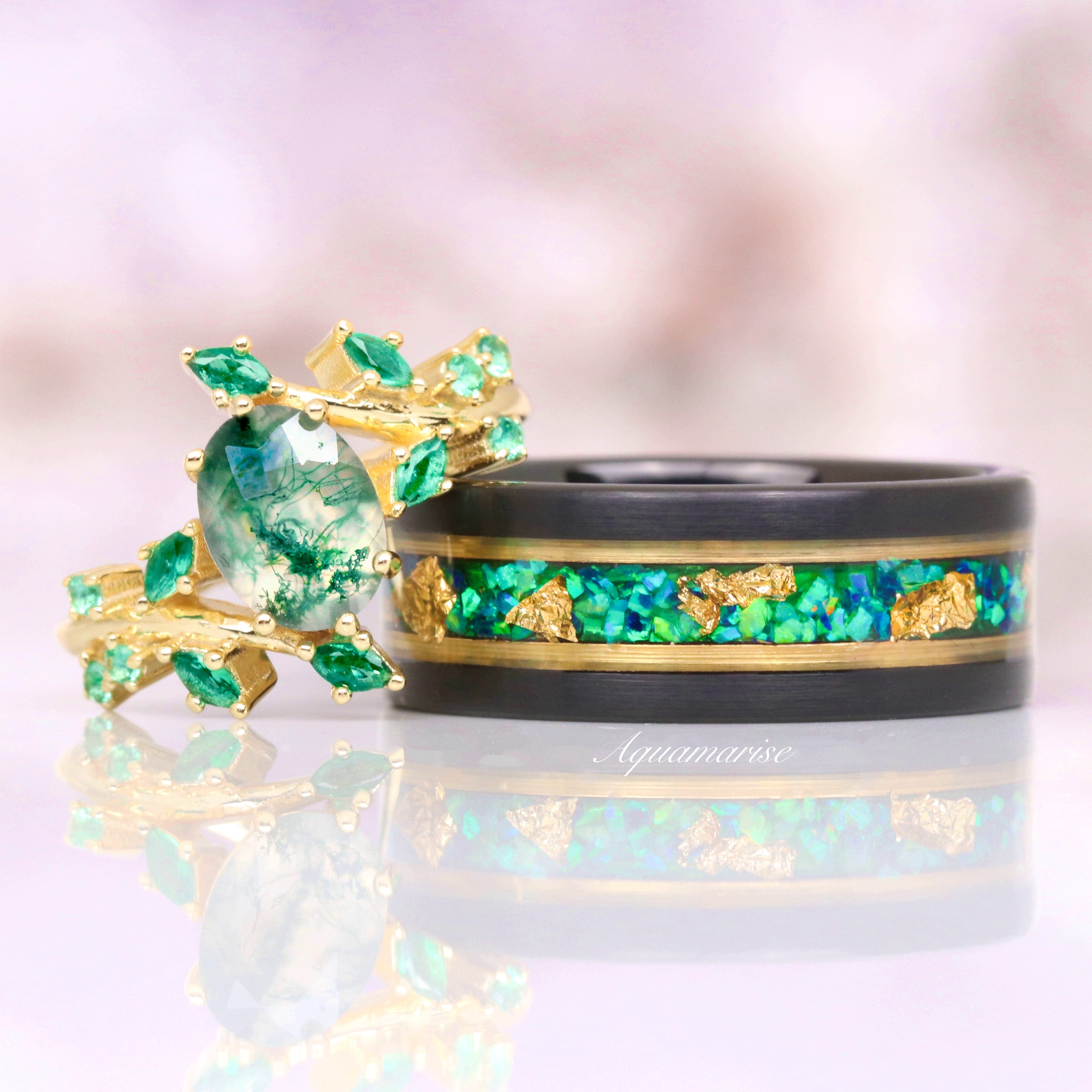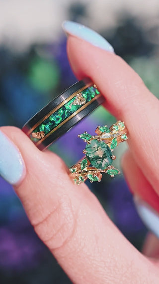 Immerse yourself in the tranquility of nature with this exquisite Green Moss Agate & Emerald Leaf Ring, handcrafted in luxurious 14K Yellow Gold Vermeil. Each ring features a natural moss agate gemstone with unique green inclusions that resemble a miniature forest captured within stone. Accented with delicate emerald-colored vines and leaves, this piece embodies elegance, balance, and a deep connection to nature.