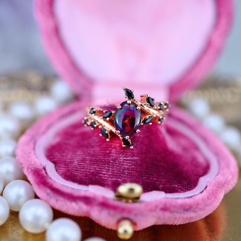 Black Fire Opal & Onyx Leaf Couples Ring Set