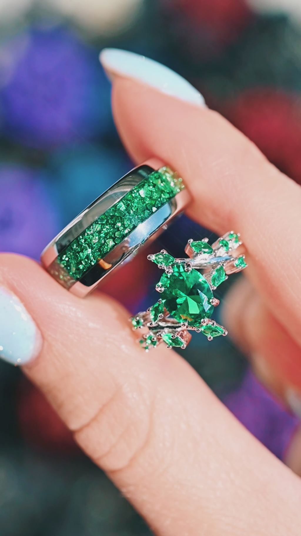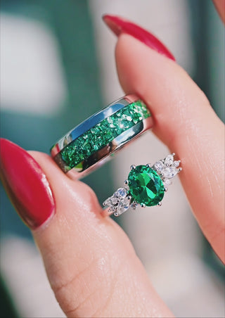 ►The focal point of this exceptional piece is the crushed emerald inlay, adding a touch of vibrant green elegance to the polished dome surface. The emerald, a symbol of rebirth and love, is expertly integrated into the design, creating a stunning contrast against the silver tungsten backdrop. The 8mm width of the band strikes a perfect balance between boldness and sophistication, making it an ideal choice for those seeking a ring that stands out while maintaining a classic appeal.