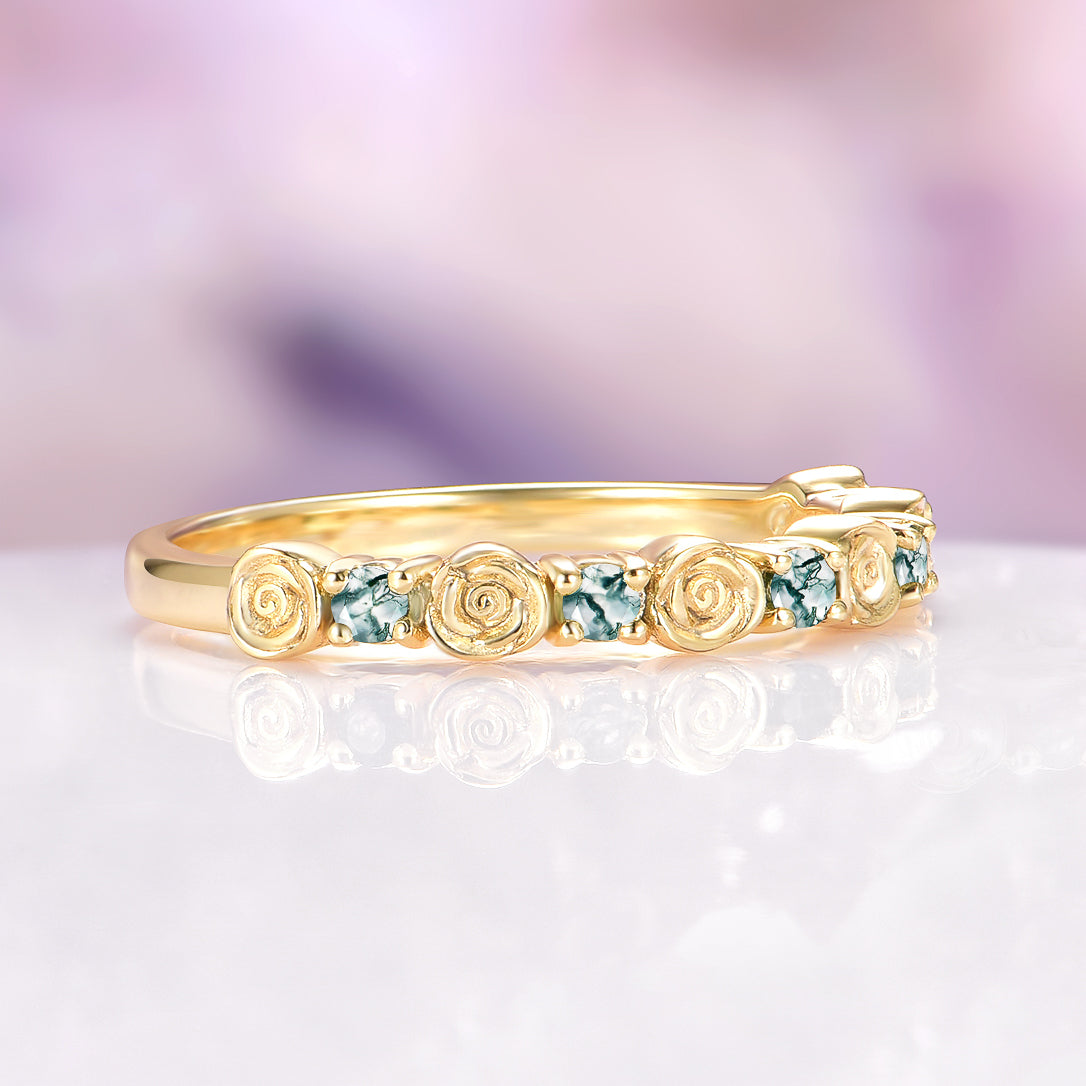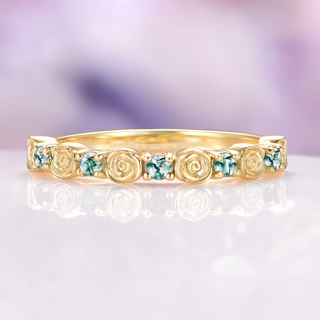Delicate and enchanting, the Natural Green Moss Agate Rose Wedding Band in solid 14K yellow gold is a poetic tribute to nature’s beauty and enduring love. Sculpted rose motifs intertwine with genuine natural moss agate stones, each gem featuring one-of-a-kind green inclusions that resemble delicate moss suspended in crystal.