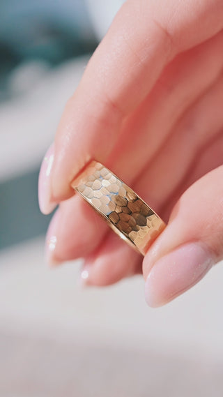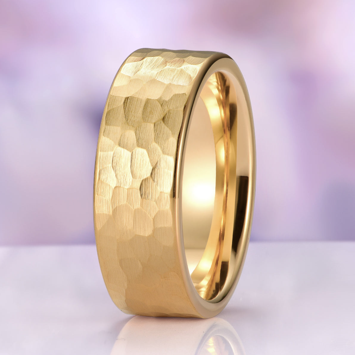 Designed for the man who values strength with artisanal texture, this hammered tungsten carbide ring brings together rugged durability and elevated style. Finished in a rich gold tone with a brushed hammered surface, this 8mm comfort-fit band is both modern and timeless — a perfect symbol of commitment.