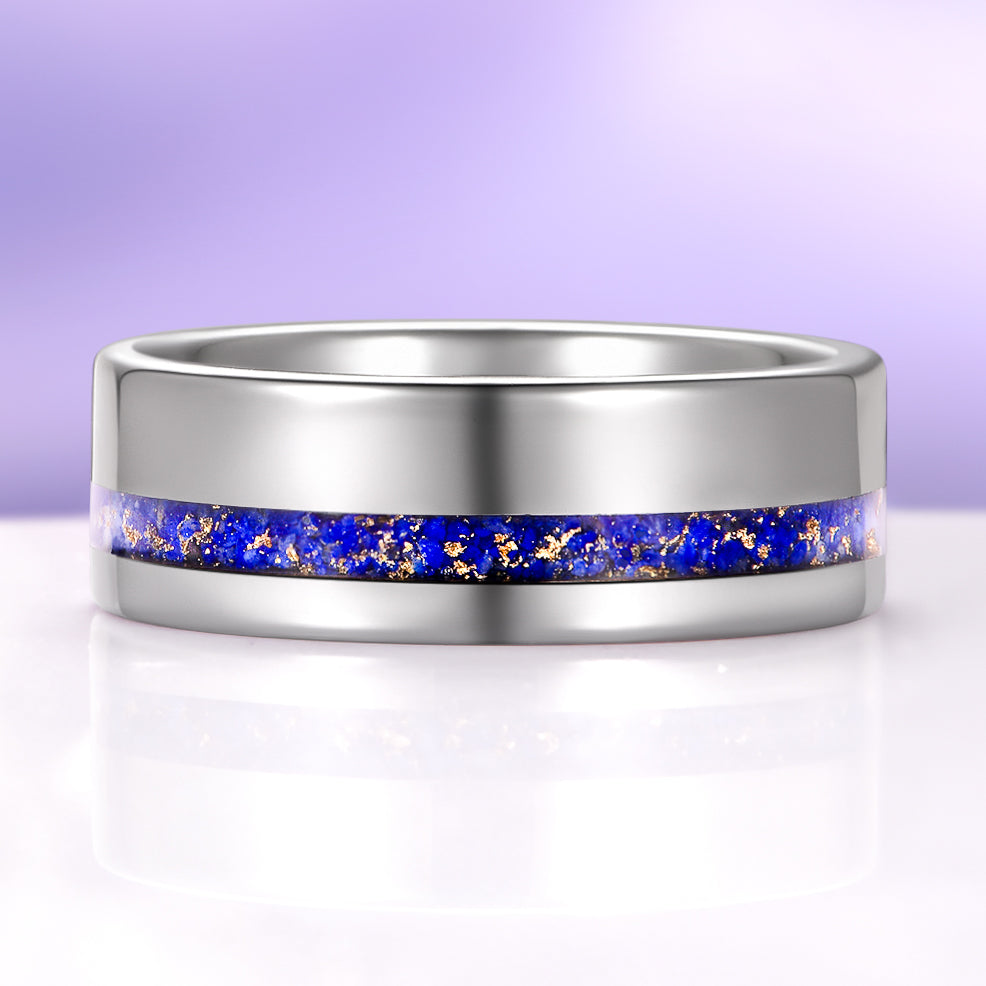 A striking fusion of modern design and natural beauty. This men’s tungsten wedding band features a vibrant offset inlay of natural lapis lazuli accented with shimmering gold foil, creating a bold yet refined contrast against the high-polished silver finish.