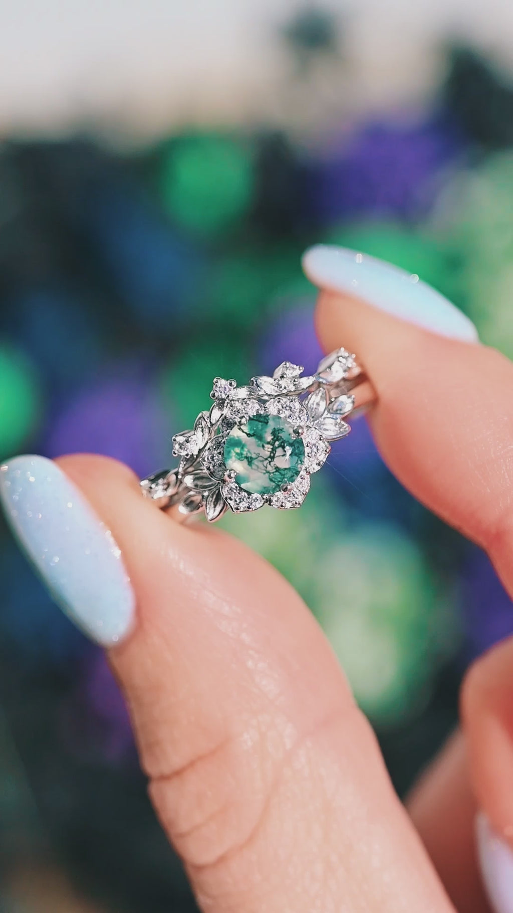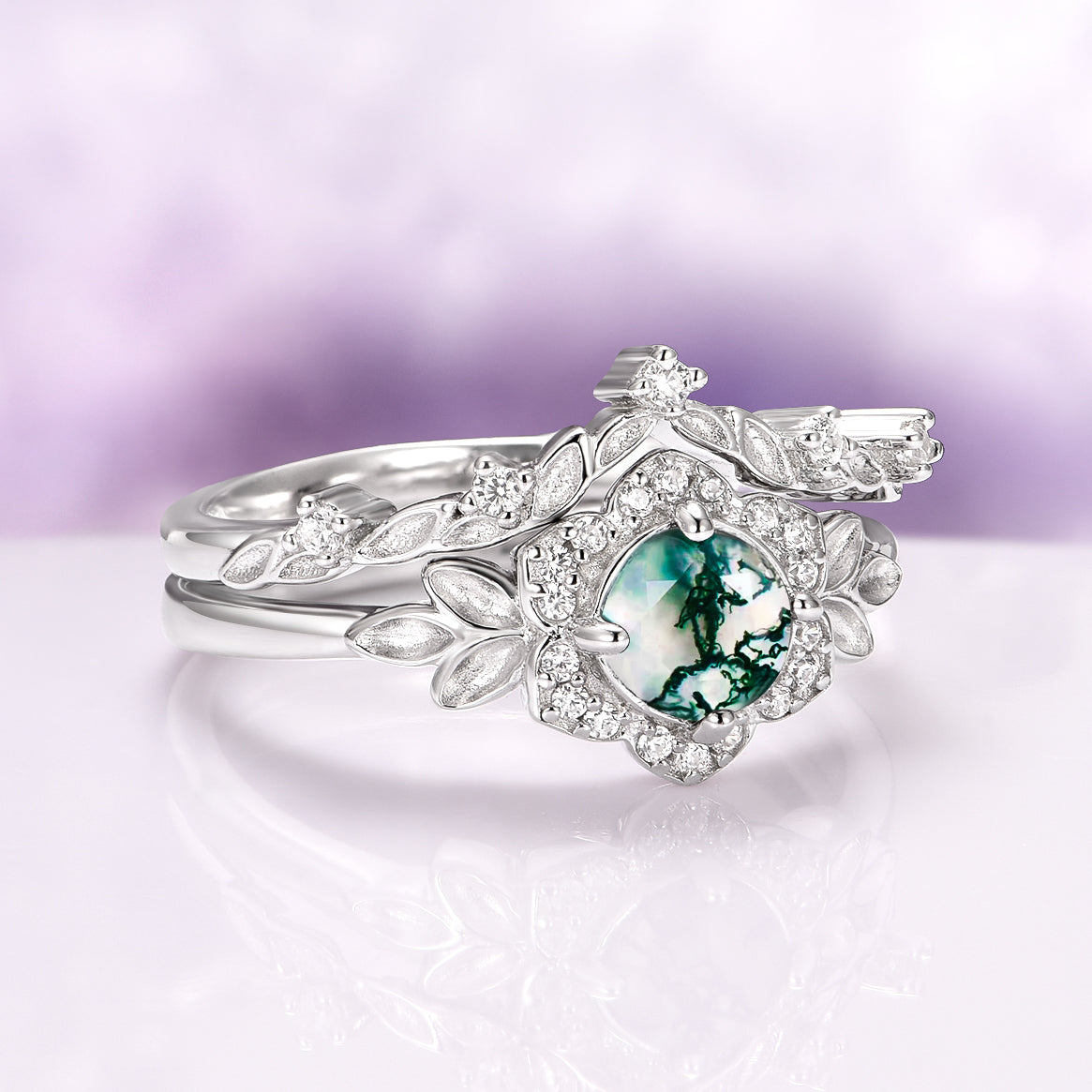 Moss Agate Fairy Leaf Ring Set in 14K White Gold