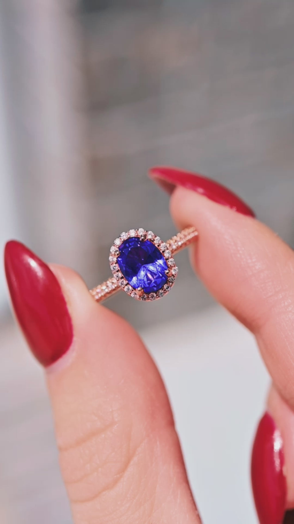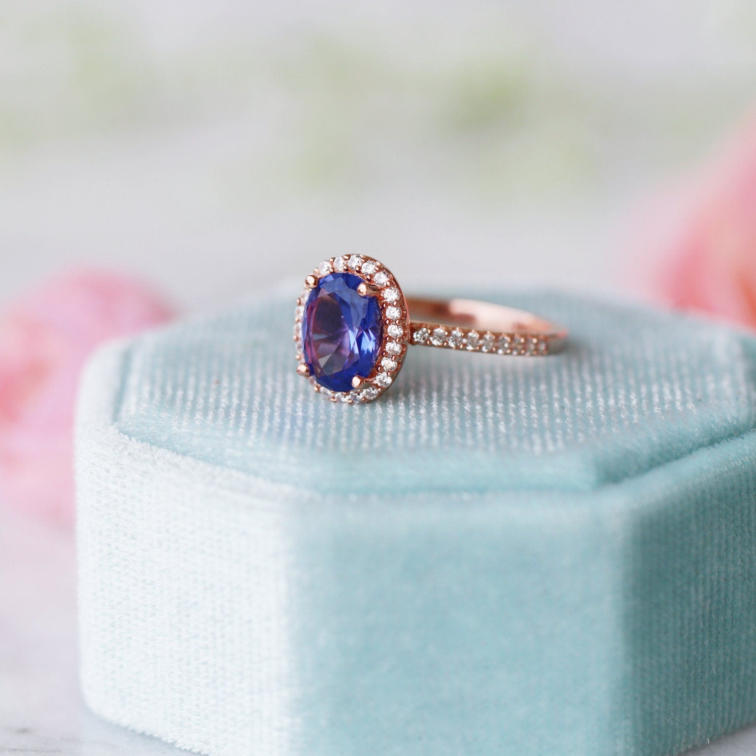 Capture timeless elegance with this vintage-inspired Tanzanite halo ring, featuring a romantic oval-cut center stone surrounded by shimmering simulated diamonds. Set in a blush-toned 14K rose gold vermeil over solid 925 sterling silver, this piece combines antique charm with modern craftsmanship.
