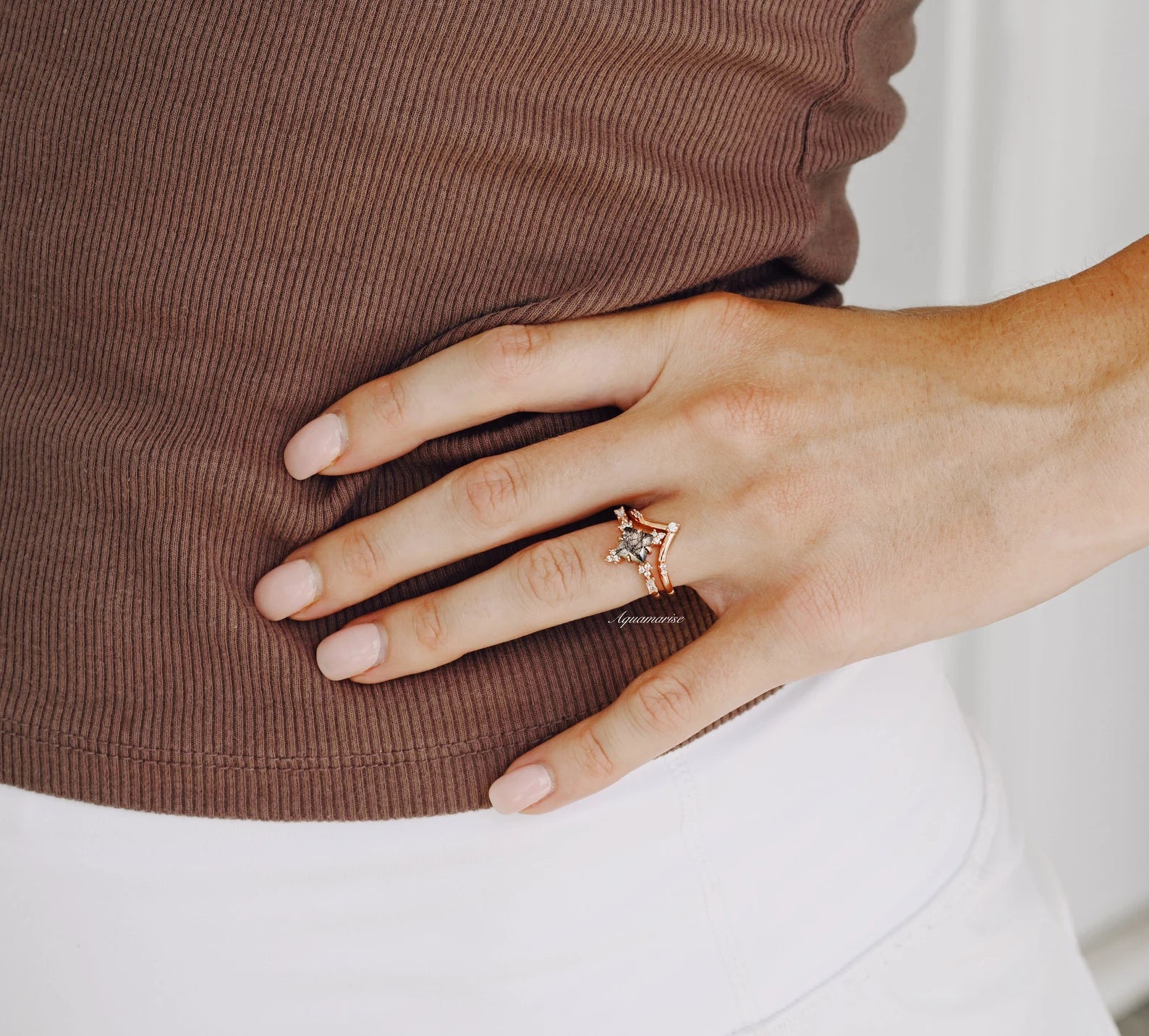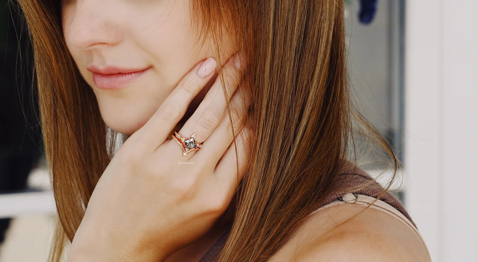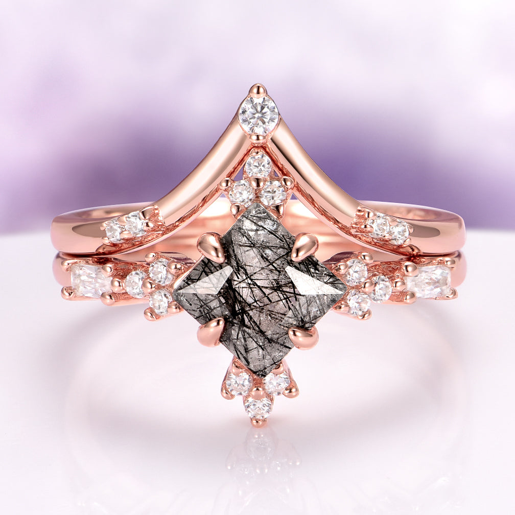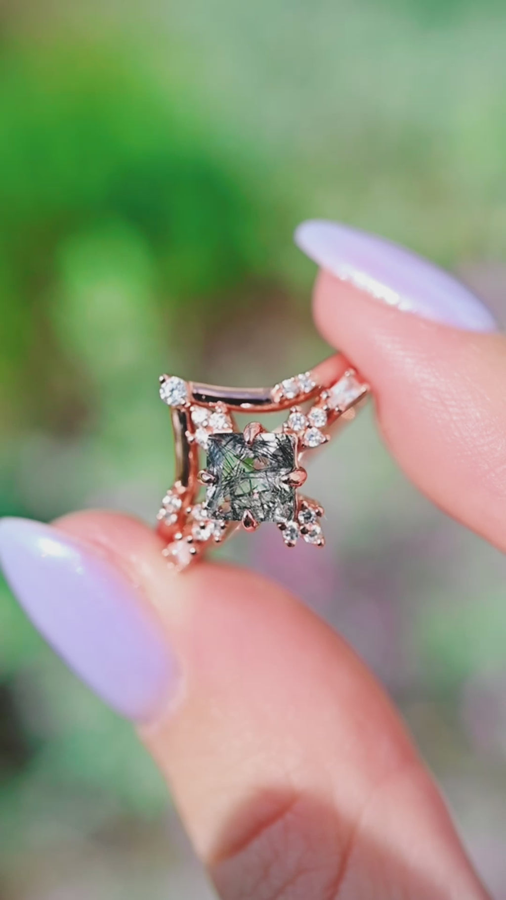 Introducing the Princess Cut Rutilated Quartz Engagement Ring Set, a unique and modern pairing that embodies strength, elegance, and individuality. Handcrafted in solid 14K rose gold, this heirloom-quality set features a striking princess-cut natural black rutilated quartz, admired for its dramatic inclusions that make every stone one-of-a-kind. The bold geometric cut is enhanced by your choice of moissanite or natural diamond accent stones, adding a refined sparkle to the quartz’s natural intrigue. A perfectly matched rose gold wedding band completes the set, creating a harmonious union of artistry and timeless design. This ring set is both distinctive and enduring — the perfect symbol of a love unlike any other.