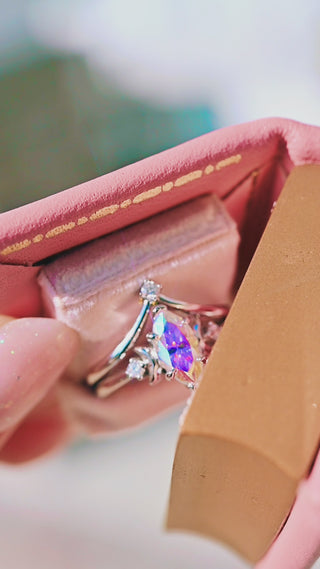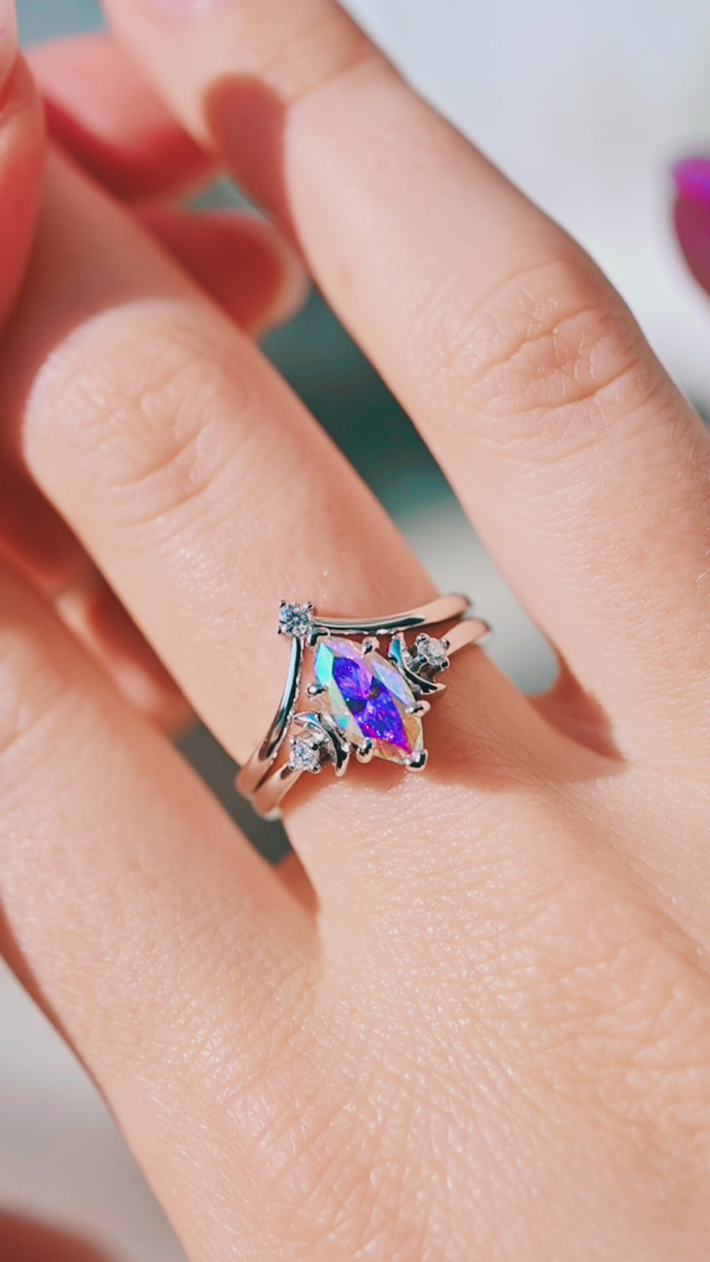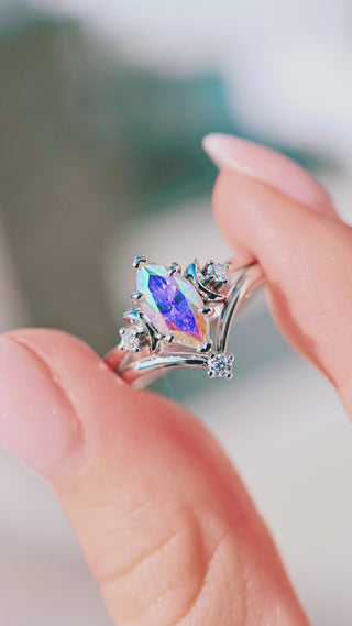 Inspired by celestial beauty, this enchanting engagement ring set features a brilliant marquise-cut rainbow moissanite at its center, alive with shifting pastel flashes of violet, blue, and gold. Set in solid 925 sterling silver, the center stone is framed by crescent-moon motifs and sparkling D-color colorless moissanite accents. The accompanying chevron band adds a graceful finishing touch, creating a complete bridal set with ethereal elegance and modern shine.