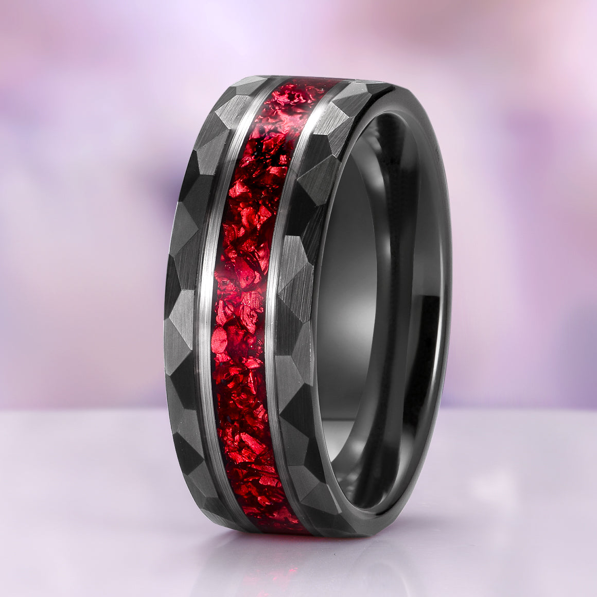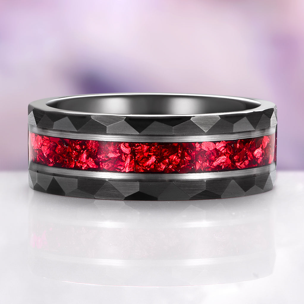 A bold blend of rugged texture and refined natural beauty. This men’s wedding band features a deep black tungsten carbide base with a striking crushed natural red garnet inlay, complemented by a sleek silver strip that adds modern contrast. The rich red tones of the garnet stand out against the hammered matte finish, creating a powerful, earthy aesthetic that feels both contemporary and timeless. Expertly crafted for everyday wear, this straight comfort-fit ring offers exceptional durability and a smooth, effortless feel. Perfect for those who appreciate bold materials, clean design, and a touch of natural intensity.