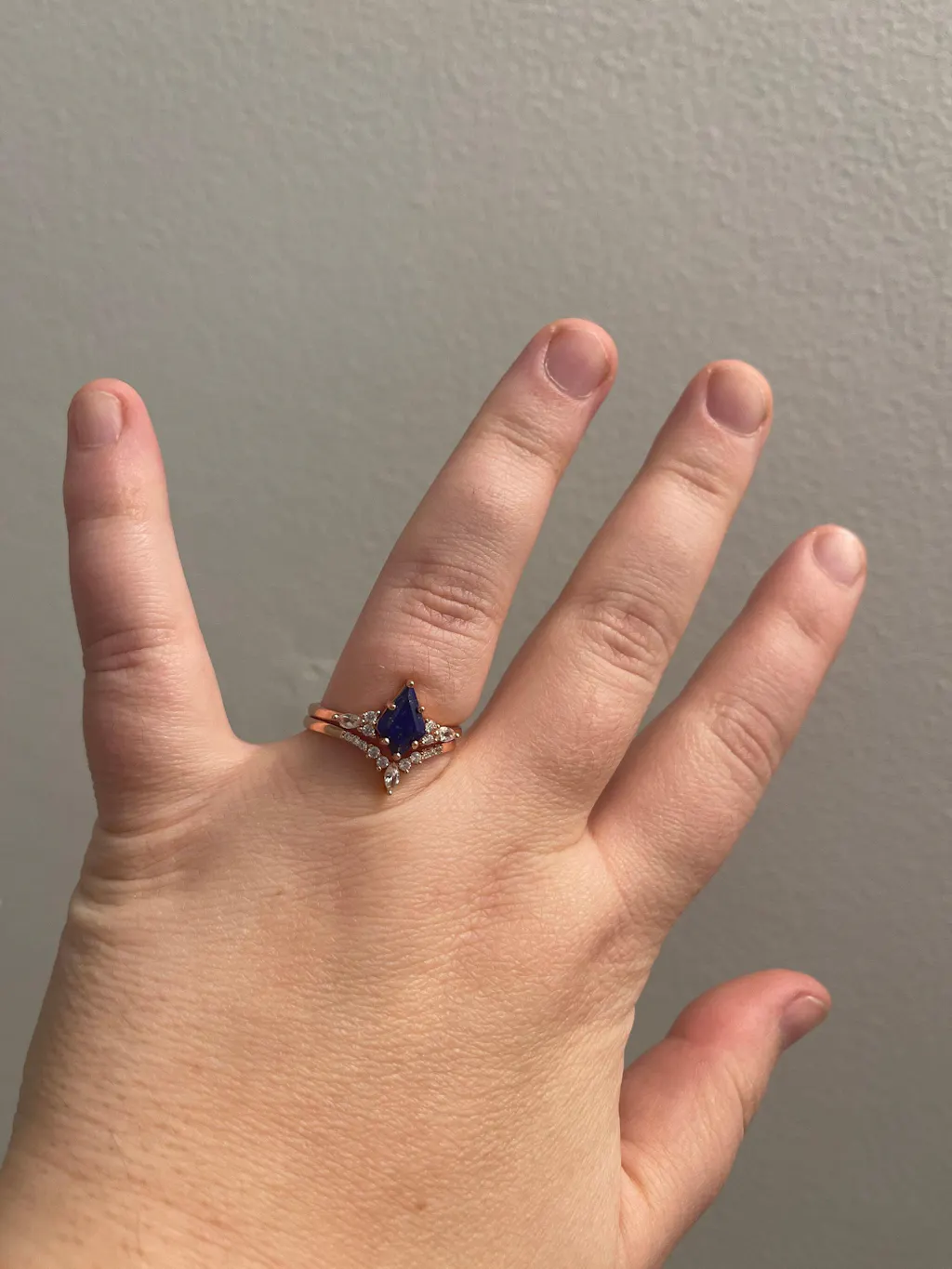 Rose gold ring with a blue gemstone and small diamonds on a light purple background