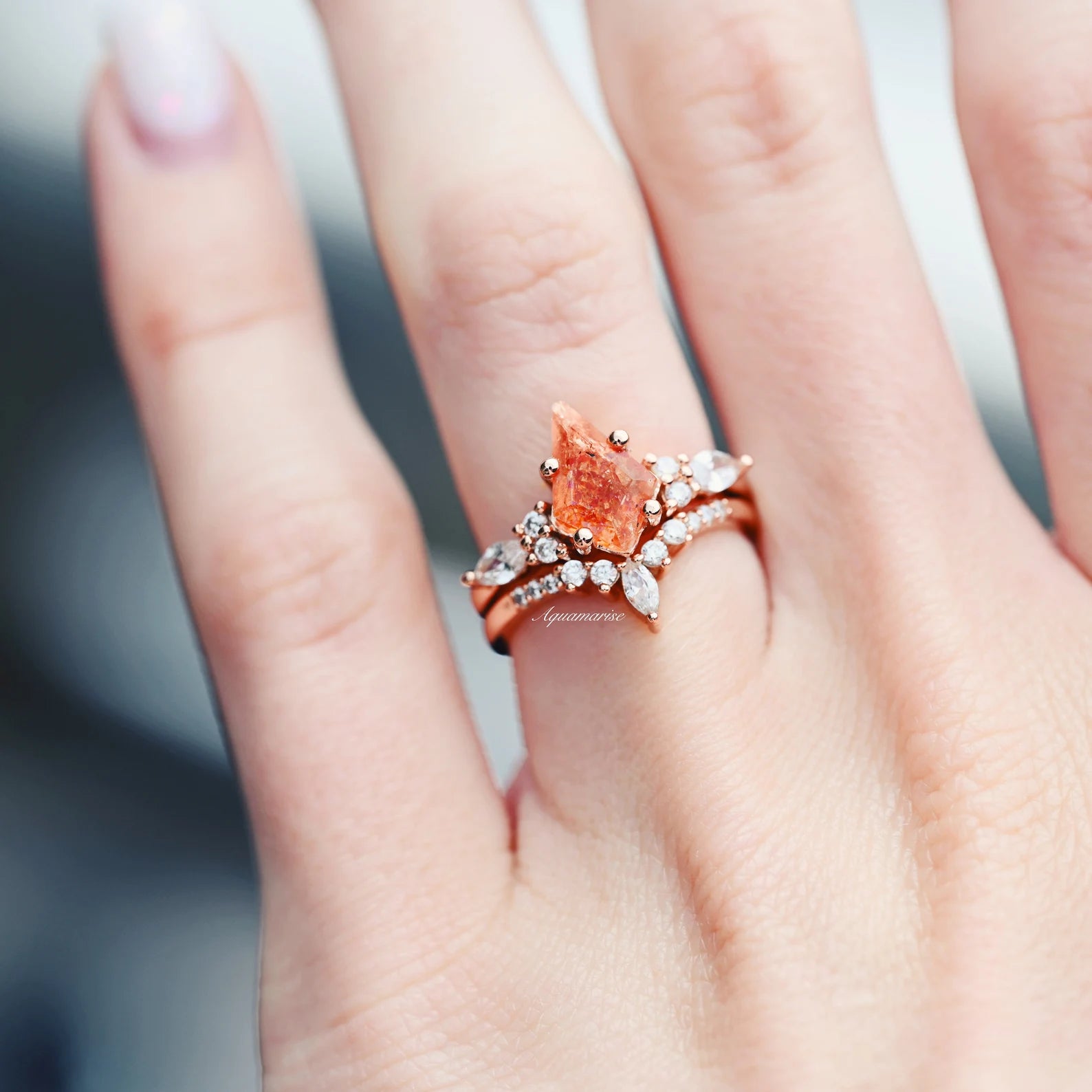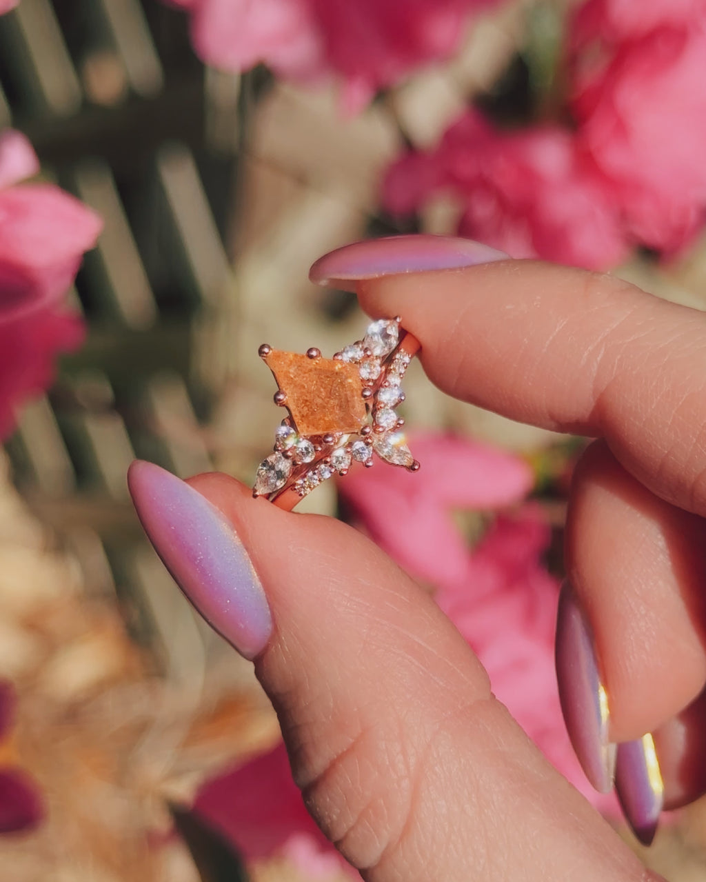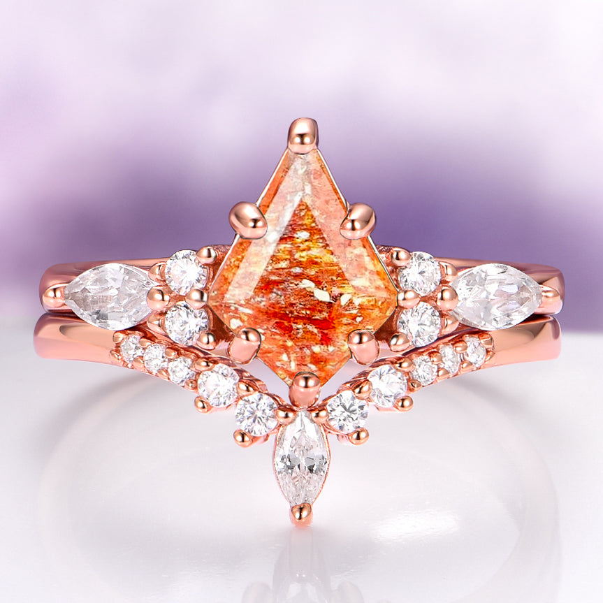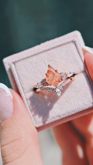Evoke the timeless beauty of vintage romance with this Kite Cut Sunstone Ring Set, delicately crafted in 14K rose gold vermeil. The warm peach-gold hues of the natural sunstone shimmer with a soft, ethereal glow—capturing sunlight in every angle. Paired with a perfectly fitted accent band, this ring set is a radiant expression of love, artistry, and individuality.