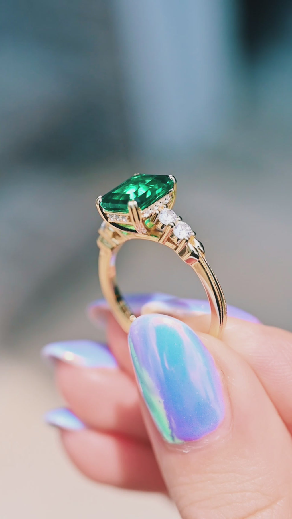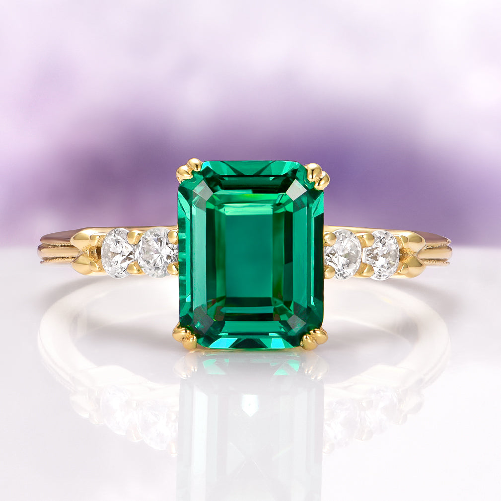 Exquisite Green Emerald Ring, a dazzling testament to love and timeless elegance. Crafted with meticulous attention to detail, this set features a stunning Emerald Cut emerald gemstone cradled in a setting of lustrous 14K yellow gold vermeil, creating a truly captivating piece of jewelry.
