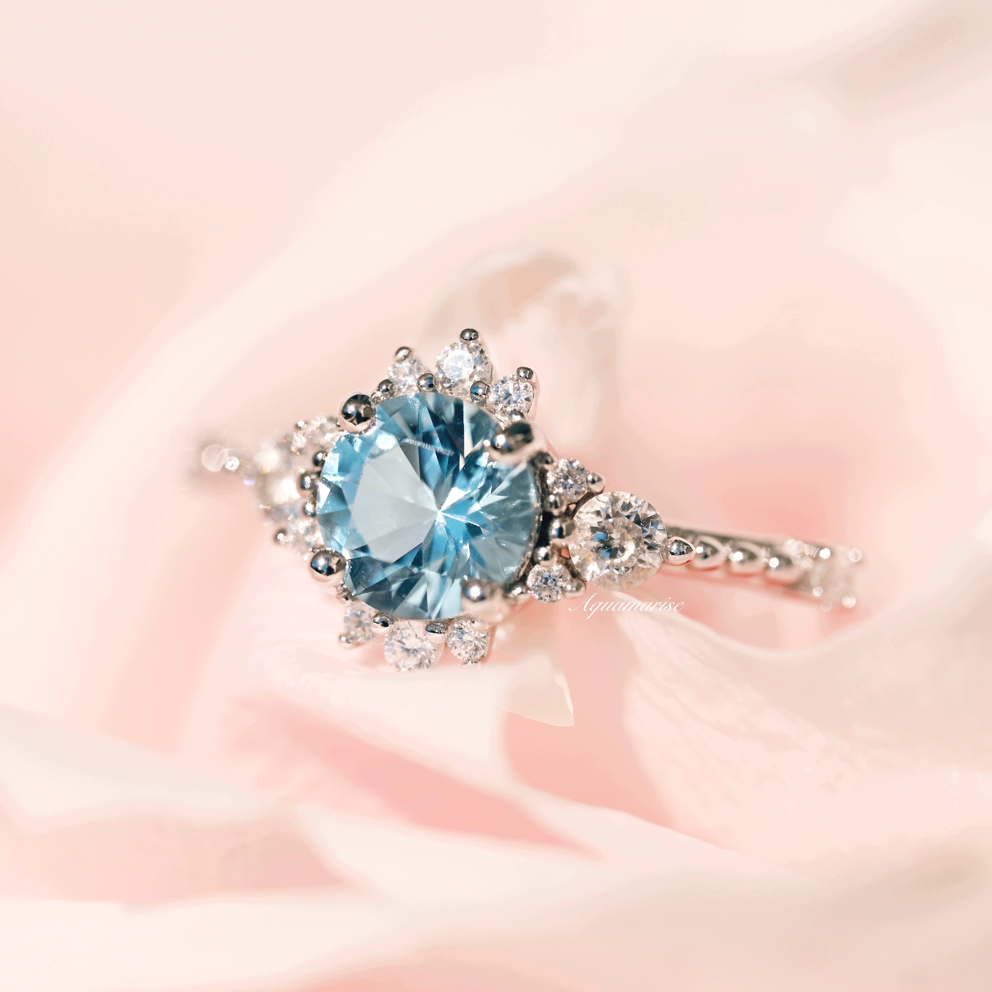 Capture the elegance of a timeless love story with this vintage-inspired aquamarine engagement ring. Designed for the woman who loves subtle sophistication, this dainty round cut ring is perfect as an engagement ring, promise ring, or meaningful March birthstone gift.
