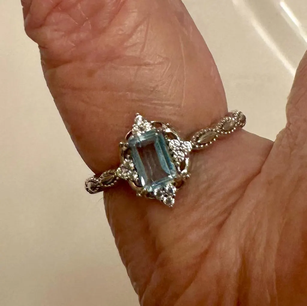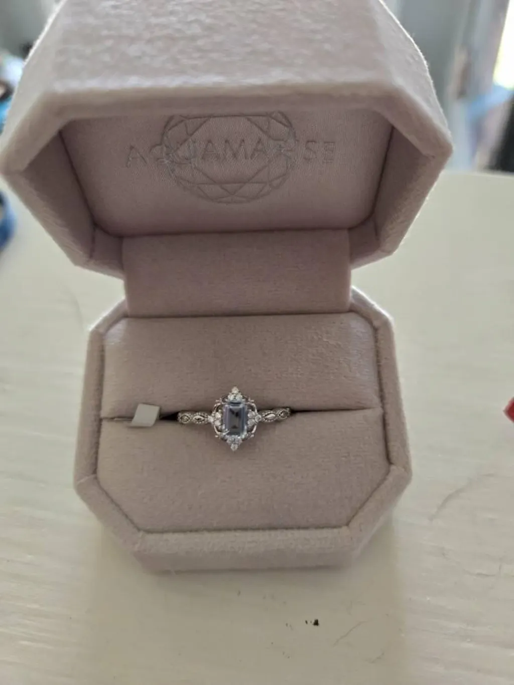Stunning, gorgeous ring! This beautiful aquamarine ring is my absolute favorite ring I’ve ever owned. The gem is clear & large & the setting is eloquent & well designed & crafted. I have been looking for an aquamarine for years to wear in memory of my sister as her birthstone & this ring is perfect for that especially with the excellent engraving they offered I had done in her honor. I’ve bought other aquamarines in the past I had to return after they faded & lost their blue color & other issues but I am thankful I found this one as it’s quality workmanship is the best I’ve seen at a great price. I can’t recommend Aquamarise enough & would def buy from them again.